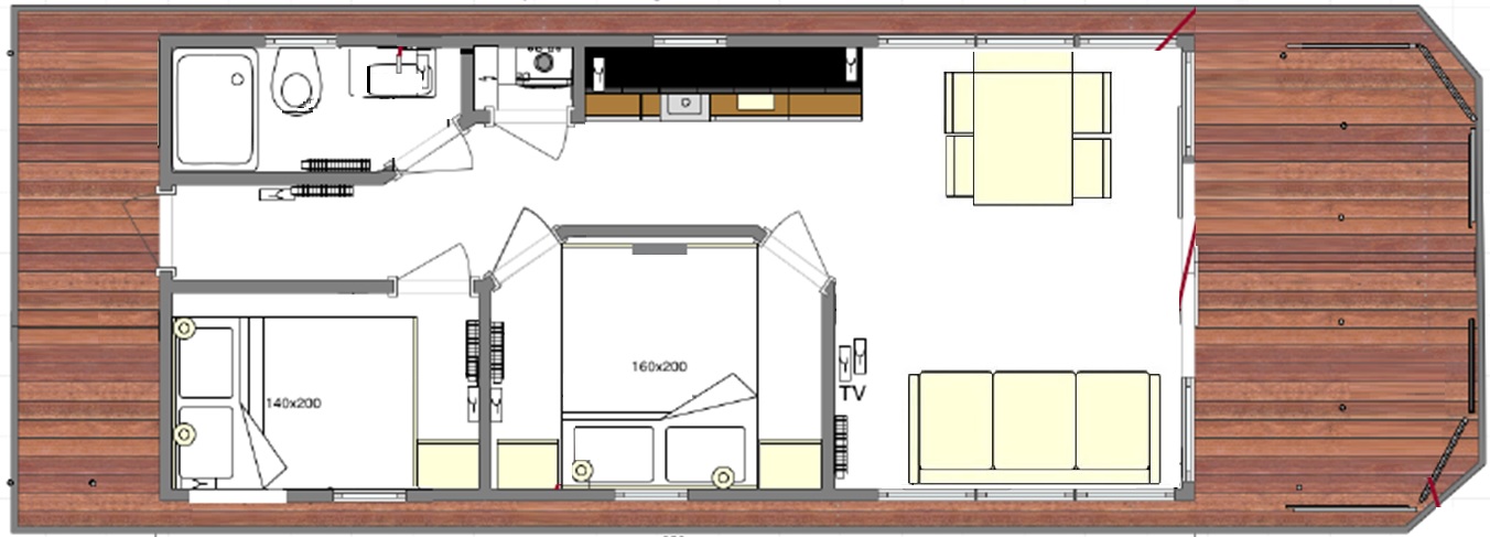 Im Inneren des Hausbootes finden Sie neben dem Wohnraum mit Fußbodenheizung für kalte Tage zwei Schlafräume mit je einem Doppelbett sowie ein modernes Duschbad. Genügend Stauraum finden Sie in den Schränken sowie in den Schubladen unter den Betten.