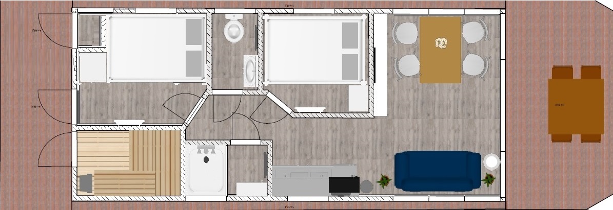 Im Inneren des Hausbootes finden Sie neben dem Wohnraum mit Fußbodenheizung für kalte Tage zwei Schlafräume mit je einem Doppelbett sowie ein modernes Duschbad. Genügend Stauraum finden Sie in den Schränken sowie in den Schubladen unter den Betten.