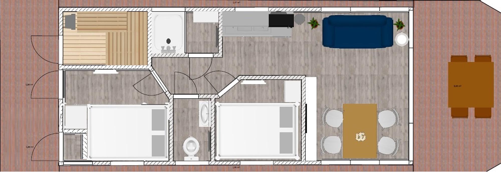 Im Inneren des Hausbootes finden Sie neben dem Wohnraum mit Fußbodenheizung für kalte Tage zwei Schlafräume mit je einem Doppelbett sowie ein modernes Duschbad. Genügend Stauraum finden Sie in den Schränken sowie in den Schubladen unter den Betten.