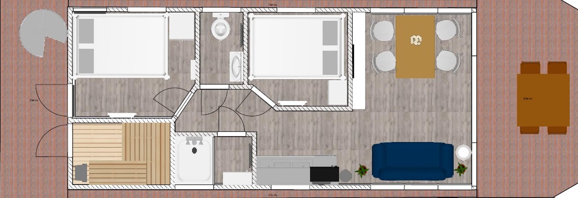 An warmen Tagen laden sowohl die zwei Sonnenterrassen vor und hinter dem Wohnaufbau als auch die Dachterrasse mit Hängematte und Loungemöbeln zum Entspannen und Sonnenbaden ein. Auf dieser haben Sie einen atemberaubenden Blick über die Weite des Wassers und können wunderbare Sonnenuntergänge genießen. Im Inneren des Hausbootes finden Sie neben dem Wohnraum mit Fußbodenheizung für kalte Tage eine Couch, zwei Schlafräume mit je einem Doppelbett (140x200cm) sowie ein modernes Duschbad. Zwei weitere Schlafmöglichkeiten befinden sich auf der ausziehbaren Couch im Wohnraum - beachten Sie jedoch bitte, der Platz ist hier begrenzt. Genügend Stauraum finden Sie in den Schränken sowie in den Schubladen unter den Betten.