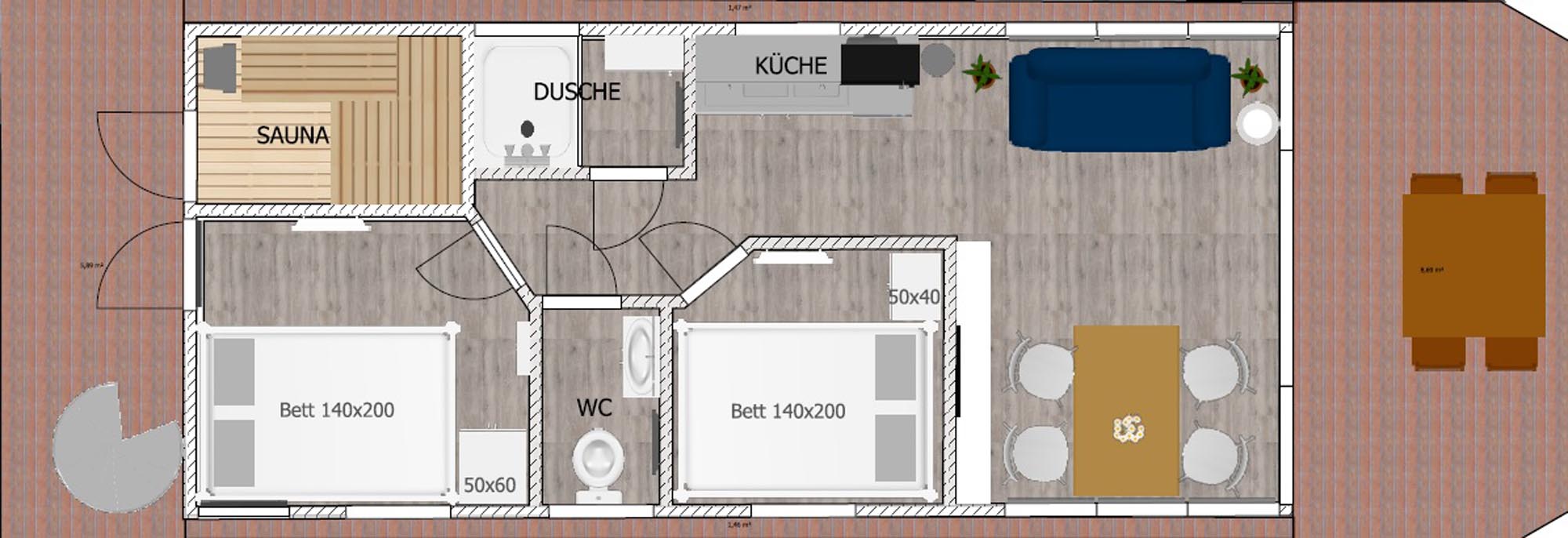 Im Inneren des Hausbootes finden Sie neben dem Wohnraum mit Fußbodenheizung für kalte Tage zwei Schlafräume mit je einem Doppelbett sowie ein modernes Duschbad. Genügend Stauraum finden Sie in den Schränken sowie in den Schubladen unter den Betten.