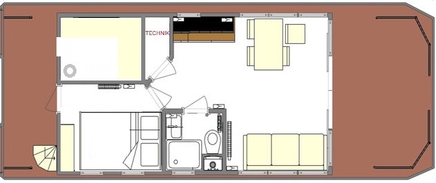 Im Inneren des Hausbootes finden Sie neben dem Wohnraum mit Schlafcouch und Fußbodenheizung für kalte Tage einen Schlafraum mit einem Doppelbett sowie ein modernes Duschbad. Zwei weitere Schlafmöglichkeiten befinden sich auf der ausziehbaren Couch im Wohnraum - beachten Sie jedoch bitte, der Platz ist hier begrenzt. Genügend Stauraum finden Sie in den Schränken sowie in den Schubladen unter den Betten.