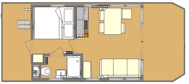 Dieses großzügige mobile Hausboot bietet Ihnen auf 32 qm Bootsfläche den ganzen Komfort einer modernen und hochwertigen Ferienwohnung mit Sonnen- und Dachterrasse. Im gemütlichen Wohnraum mit Wohnküche lässt es sich entspannt auf der ausziehbaren Couch verweilen oder Sie kommen am großzügigen Tisch zu einem leckeren Essen oder Spieleabend zusammen. Die vollausgestattete Küche mit allen wichtigen Küchengeräten und einem Induktionsherd lässt keine Wünsche offen.